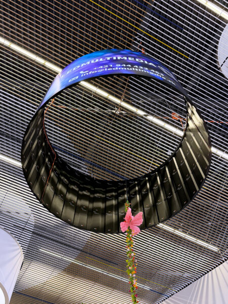 Priamo nad food courtom v OC OPTIMA pribudla pomerne veľká LED obrazovka kruhového tvaru. Pôsobí moderne a svojím tvarom dopĺňa kruhové dekorácie na strope obchodného centra.